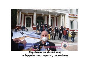 Παρέδωσαν τα κλειδιά τους οι Σερραίοι επιχειρηματίες της εστίασης Οι Σερραίοι επιχειρηματίες, που συμμετείχαν στη συλλογή κλειδιών των επιχειρήσεών τους, για να παραδοθούν τα “κλειδιά της εστίασης” στο Μέγαρο Μαξίμου. Υπογράμμισαν σε όλους τους τόνους πως οι 81.000 επιχειρήσεις στην εστίαση που απασχολούν 350.000 εργαζόμενους επιχειρήσεις εστίασης και συναφών επαγγελμάτων, κινδυνεύουν με λουκέτα. Δεν αντέχει η εστίαση Οι … Συνεχίστε να διαβάζετε το Η εστίαση των Σερρών παρέδωσε τα κλειδιά της.