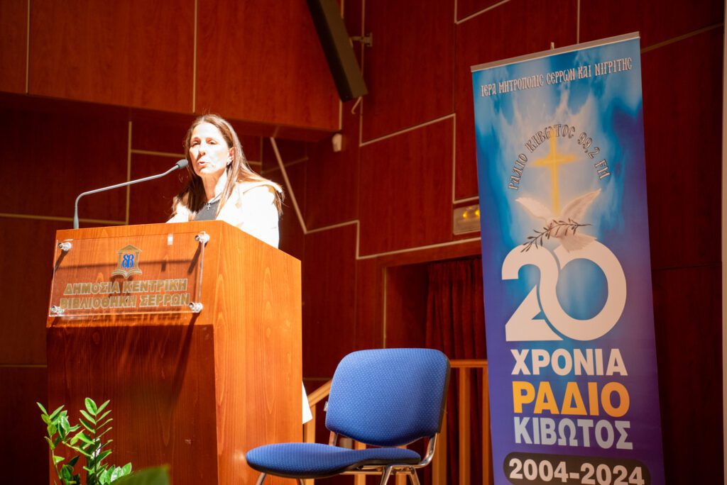 Ακολούθως, η εκπαιδευτικός και ραδιοφωνική παραγωγός της καθημερινής εκπομπής «Πρωϊνός περίπατος» του Ρ/Σ «Ράδιο Κιβωτός», κ. Χάρις Δημητρακούδη, εκ των πρώτων συνεργατών του ραδιοφωνικού σταθμού της Εκκλησίας των Σερρών,