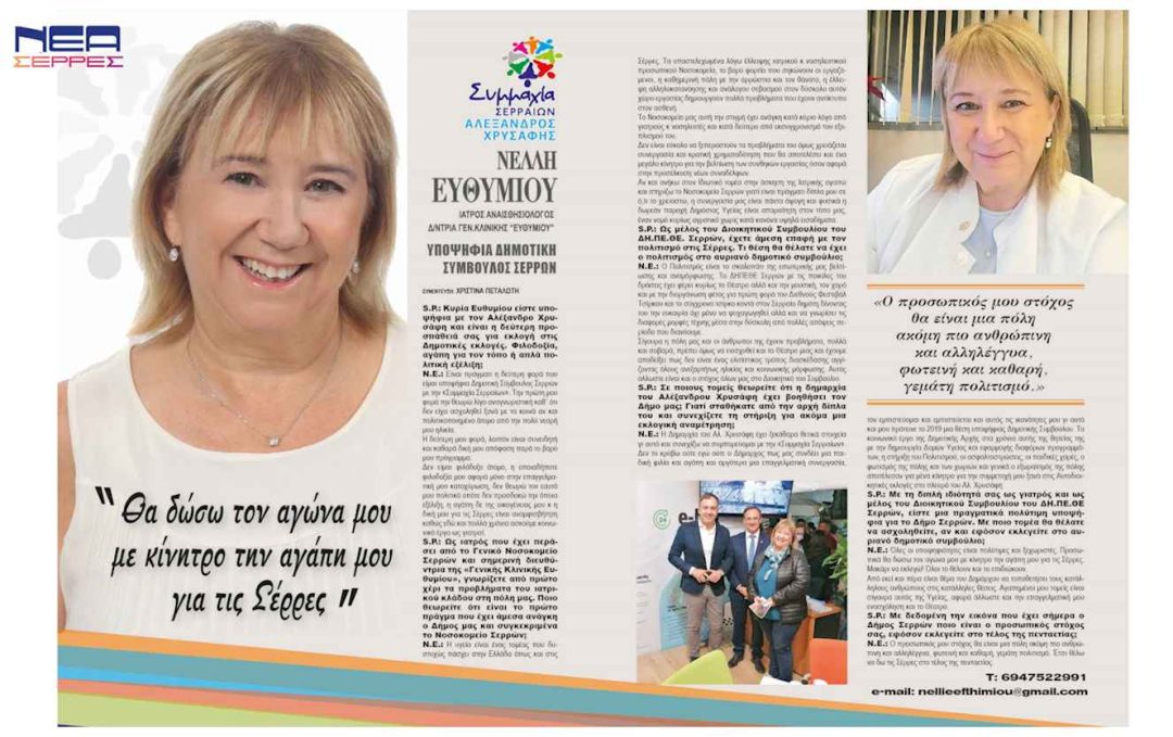 «Θα δώσω τον αγώνα μου με κίνητρο την αγάπη μου για τις Σέρρες» αναφέρει η υποψήφια δημοτική σύμβουλος Σερρών Νέλλη Ευθυμίου.