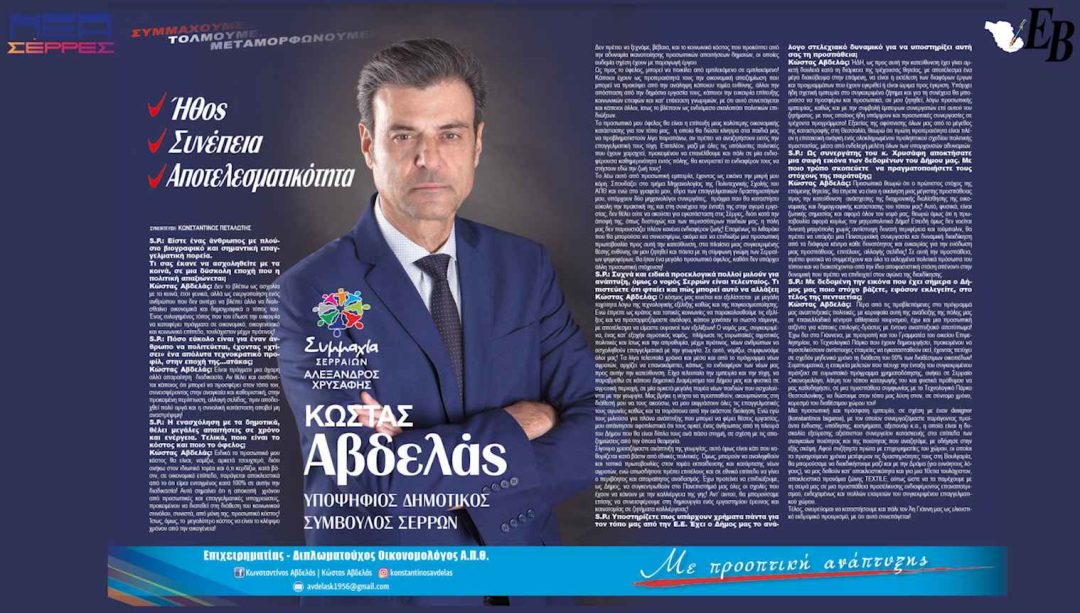 Με Ήθος, Συνέπεια, Αποτελεσματικότητα για το Δήμο Σερρών αναφέρει στη συνέντευξη του στο προεκλογικό τεύχος του SocialProfile o υποψήφιος Δημοτικός Σύμβουλος Σερρών Κώστας Αβδελάς...