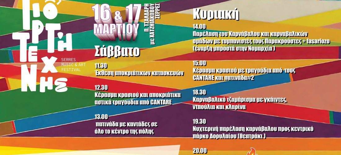 Ο σύλλογός ΓΙΟΡΤΗ ΤΕΧΝΗΣ ΣΕΡΡΩΝ σας καλεί στο Καρναβάλι 2024 που συνδιοργανώνει με τον Δήμο Σερρών, το διήμερο Σάββατο 16 και Κυριακή 17 /3/2024.