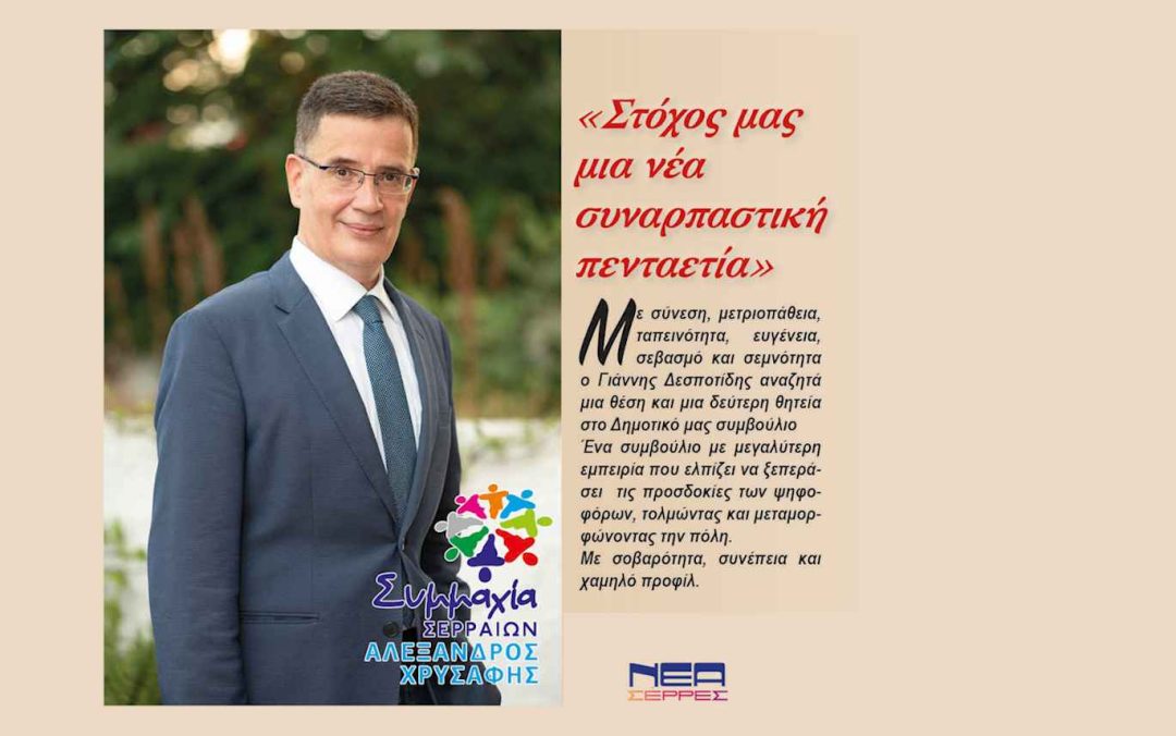 Ο Γιάννης Δεσποτίδης είναι υποψήφιος Δημοτικός Σύμβουλος με τη Συμμαχία Σερραίων του Αλέξανδρου Χρυσάφη.