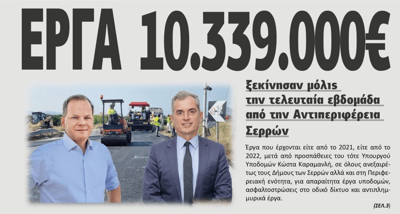 Μόλις τη τελευταία εβδομάδα πραγματοποιήθηκαν τρεις υπογραφές συμβάσεων έργων και η αρχή των εργασιών στη Περιφερειακή Ενότητα Σερρών για έργα 10.339.000 ευρώ.