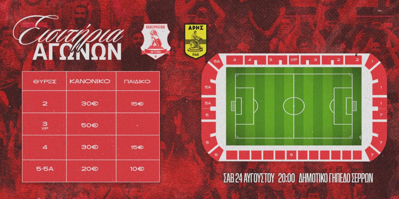 Ο Πανσερραϊκός υποδέχεται τον Άρη, το Σάββατο 24/08/2024 στις 20:00, για την 2η αγωνιστική της Stoiximan Super League.
